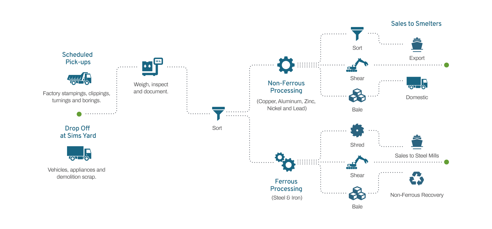 Sims Metal processes ferrous metal for resale through a variety of methods, including sorting, shredding, cutting, torching, baling or breaking. After processing, ferrous recycled metal is sold to end users, such as electric arc furnace mills, integrated steel mills, foundries and brokers.